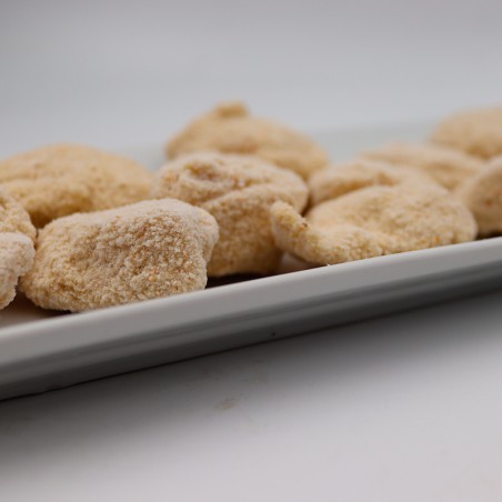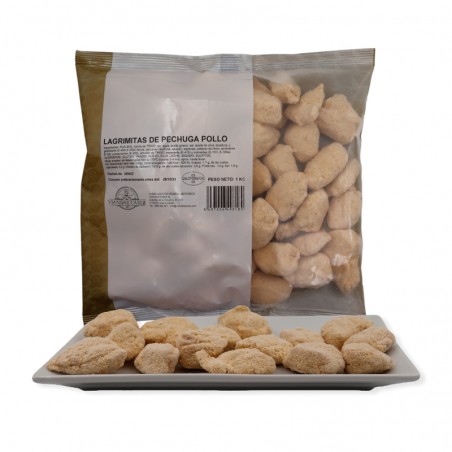 Pollo 80%, harina de TRIGO, ajo, agua, aceite girasol, sal, aceite de oliva, levadura, gasificante (E-450i,E-500i),fécula, azúcares (dextrosa, azúcar), especias, extracto de limón, acidulante E-330, conservantes (E-202), almidón de TRIGO, espesante (E-415) y colorantes (E-10li, E-160a).